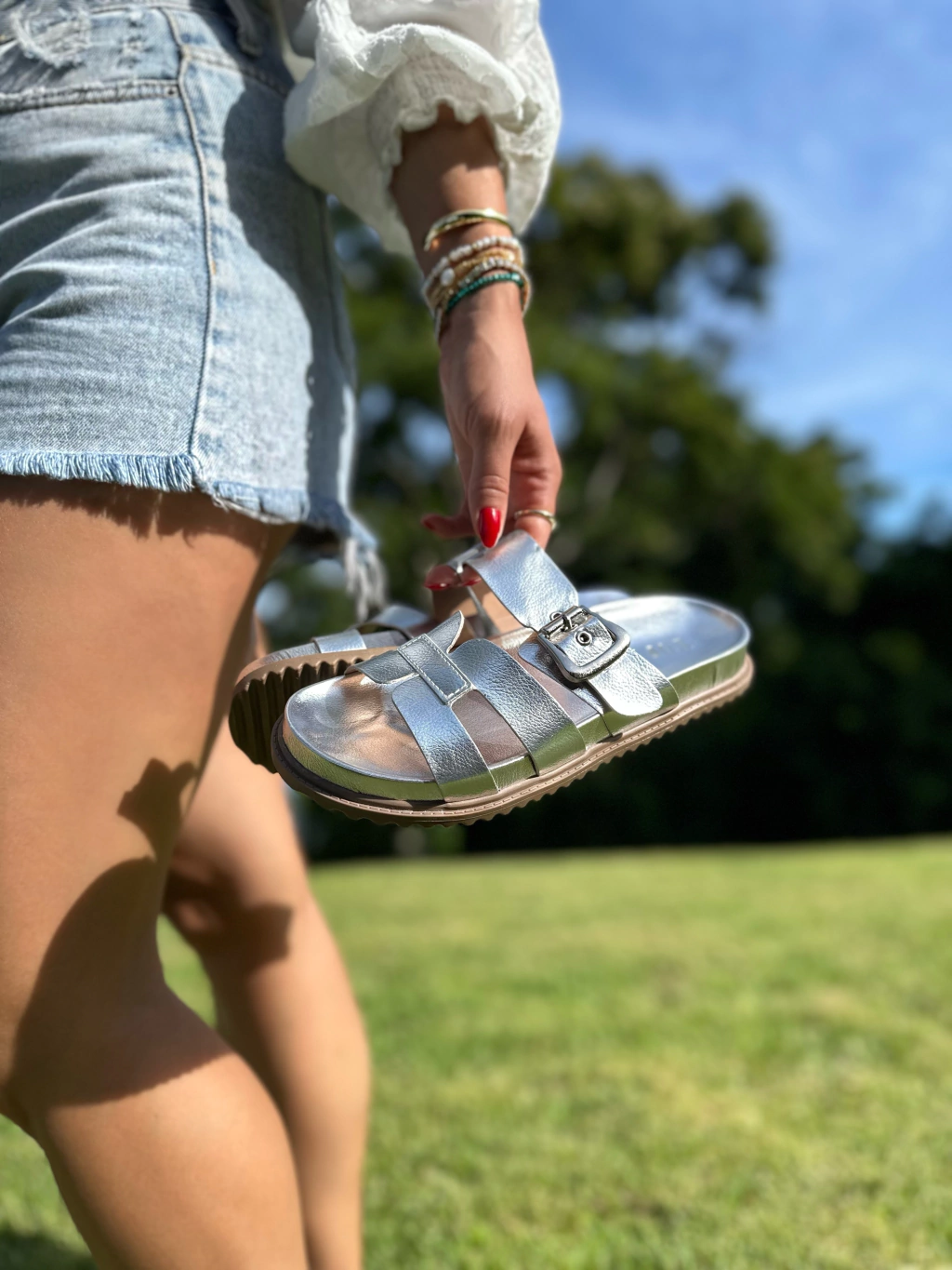 Cabedal e palmilha em napa soft metalizada prata